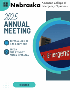 Join the Nebraska ACEP for an in-person meeting on Tuesday, July 22nd, 2025 from 5:30-8:30pm at Spezia located at 3125 S 72nd Street, Omaha, Nebraska. The evening will feature a presentation on advocacy updates from the Nebraska Medical Association.